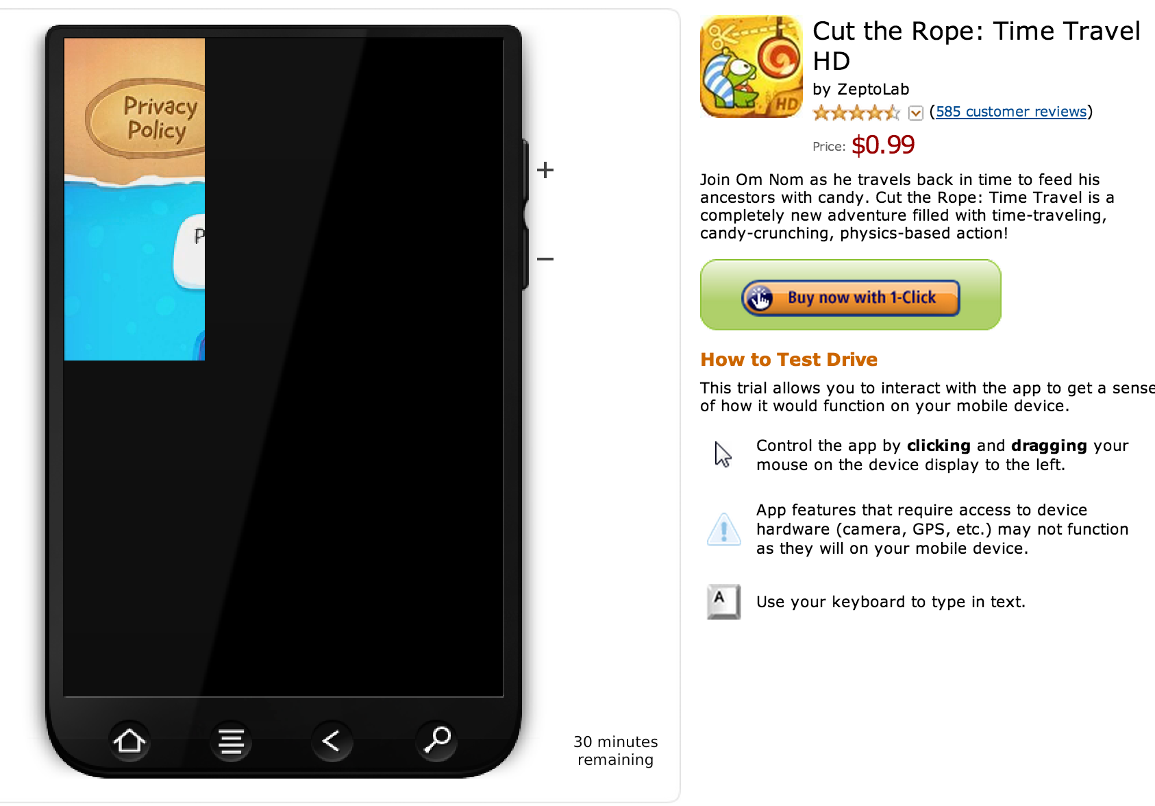 2. The Android cloud instance is only available for thirty minutes. The lower right hand corner of the cloud instance in the browser popup now displays a 30 minute timer. I personally have experienced a bug where only the top left 1/8th of my screen displays during the test drive. You can see this below in the screen capture I’ve taken.